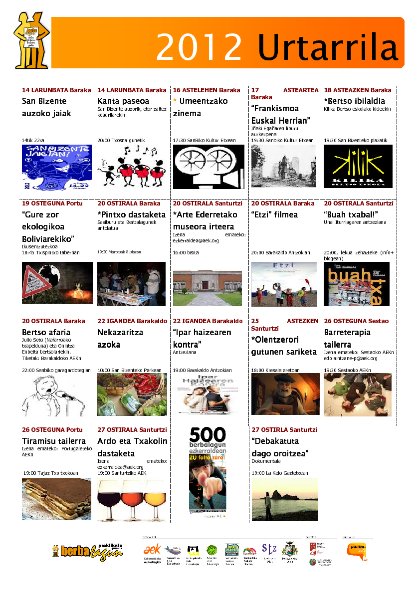 19.30 Eguzki talde ekologistaren hitzaldia “nekazaritza ekologikoa eta Nekasarea proiektua”. Hizlariak: EHNE sindikatuko kide bat eta Barakaldoko kontsumo taldeko partaideak.